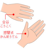 合谷は、親指と人さし指の骨の分かれ目、やや人さし指よりの手の甲にあります。親指と人さし指の骨の分かれ目、やや人さし指よりの手の甲にあります。そして、感冒点は「合谷」の真裏、手のひらにあります。