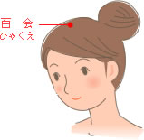 両手の中指を重ねて(女性は右手を下に、男性は左手を下に)百会にあて、2〜3分やや強めに押しもみます。ゴルフボールをあて、手のひらで小さく転がすようにして刺激するのも効果的です。