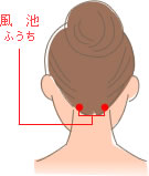 両手の親指をあて、ほかの指で頭をかかえるようにしながら押しもみます。やや力を入れながら、気持ちいいと感じるまで行います。